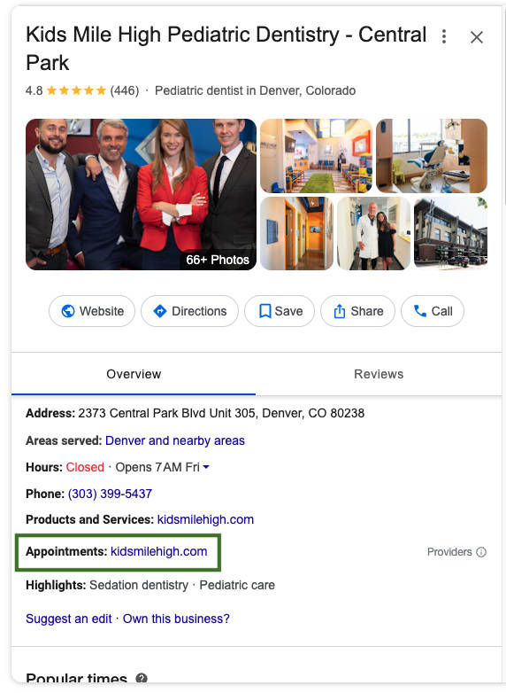 The Featured Book Button is a placement Google offers for certain integrated booking partners. However, partners are limited and may be geared toward specific platforms (for example, Apptoto is listed as a software company but only three restaurant-specific booking solutions were listed). Plus, you have to pay for these solutions in addition to any appointment booking or online scheduling software you already have. That’s why many appointment-based businesses will just use their regular booking link and the “link to your online booking tool” option.